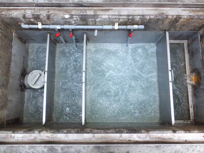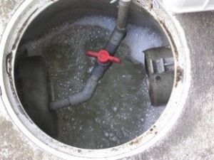 これは、厨房から出た汚水を集める槽です(グリーストラップと言います。)油水分離槽とも言い、比重の軽い油脂分を浮かせ水だけ放流します。いずれ浮上油脂分で満杯になり汲み取る必要が出てきます。また配管が詰まり汚水が溢れることがあります。